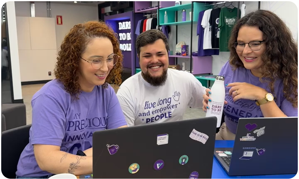 Diversidade real, contando atualmente com 48% do time de mulheres, trazendo novas perspectivas e enriquecendo times tradicionalmente masculinos